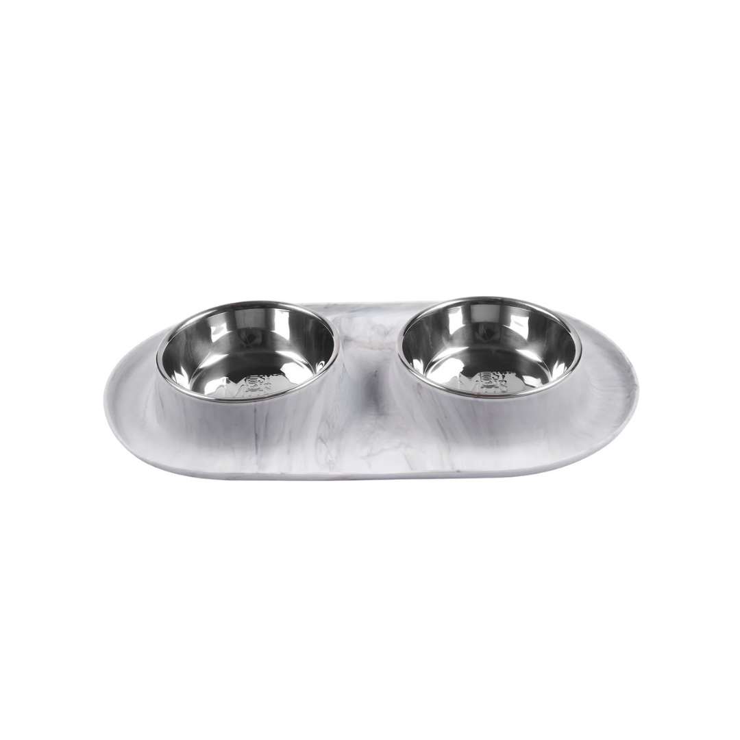 Double Silicone Dog Feeder with Stainless Bowls, Medium, Marble Design