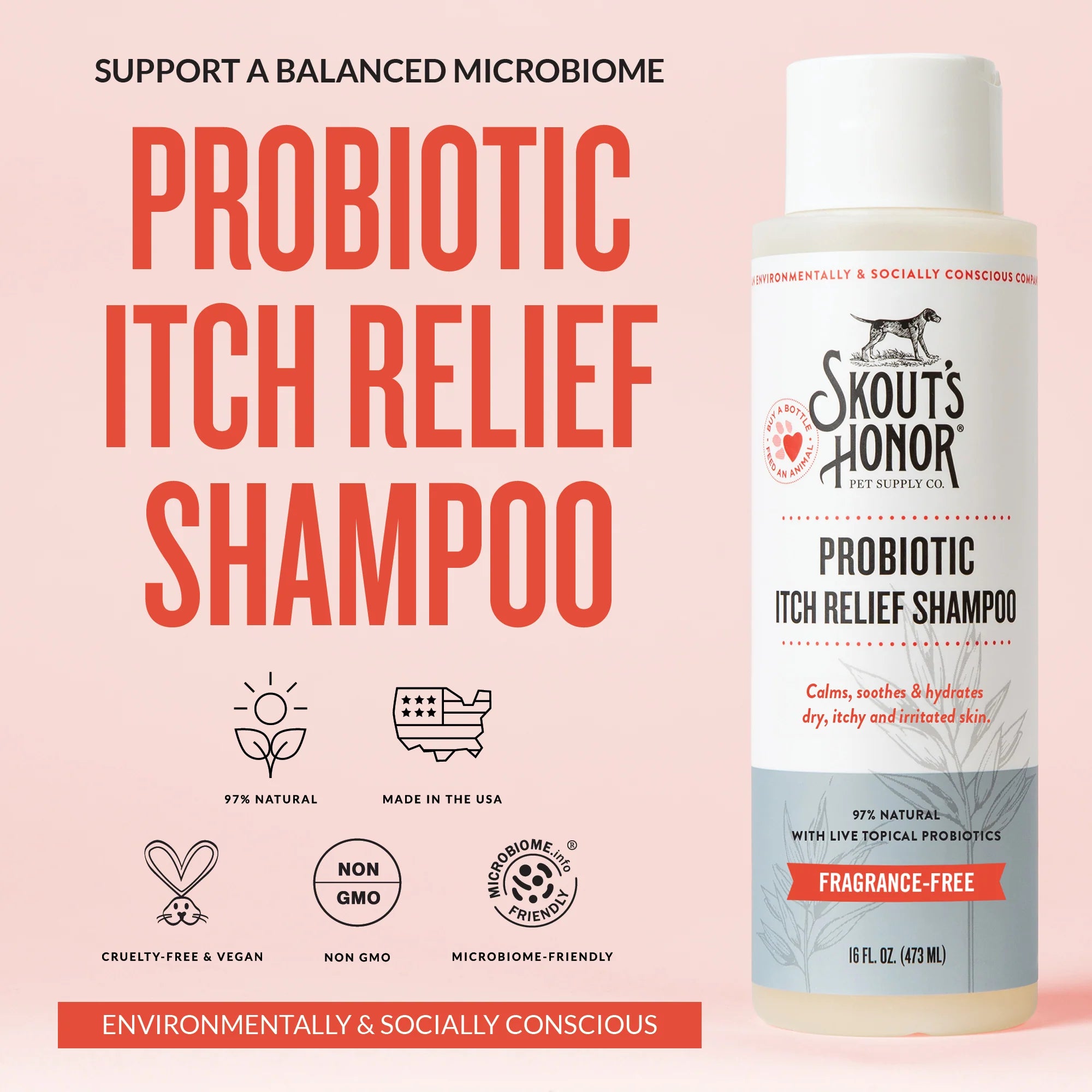 Skout’s Honor Probiotic Itch Relief Shampoo is a fragrance-free, non-medicated formula that gently cleanses, hydrates, and calms troubled skin—powered by live topical probiotics to help restore balance and comfort from the source.
