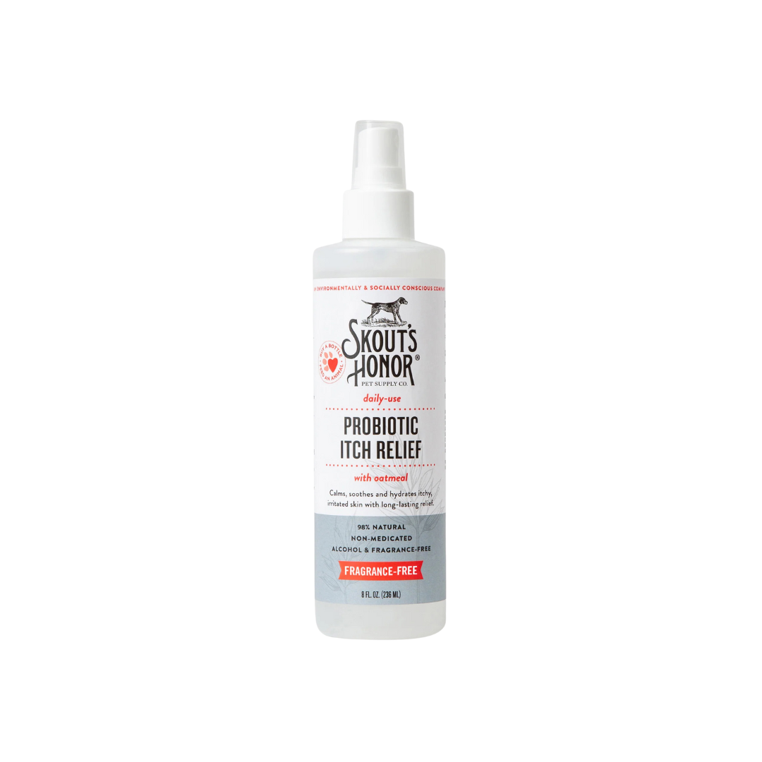 Skout’s Honor Probiotic Itch Relief Spray combines live topical probiotics, soothing aloe, and oatmeal to calm irritation, hydrate sensitive skin, and support the natural microbiome—all without medication or fragrance.