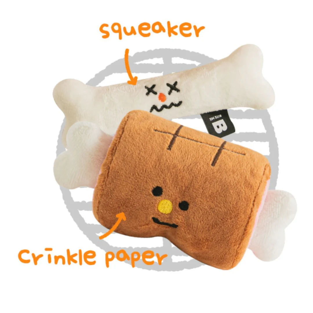 - Barbecue-meat plush design with built-in squeaker + crinkle material to keep pups engaged