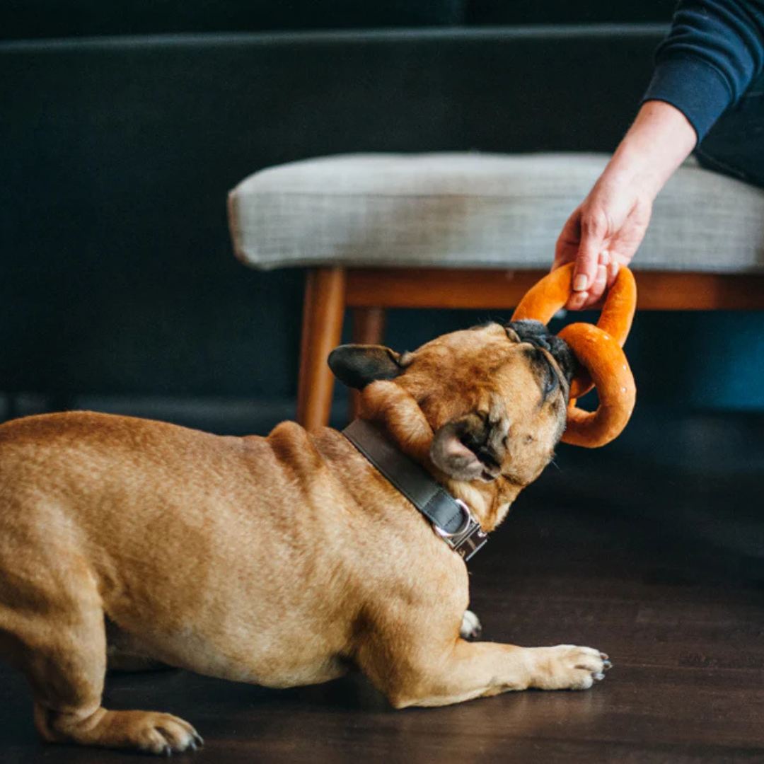 Twist, toss, and tug with the P.L.A.Y. Poochie Pretzel—a plush pretzel-shaped toy featuring two hidden tube squeakers that deliver crunchy sounds and chewy-style fun. Built for solo play or fetch, it’s an irresistible snack-inspired delight for pups.