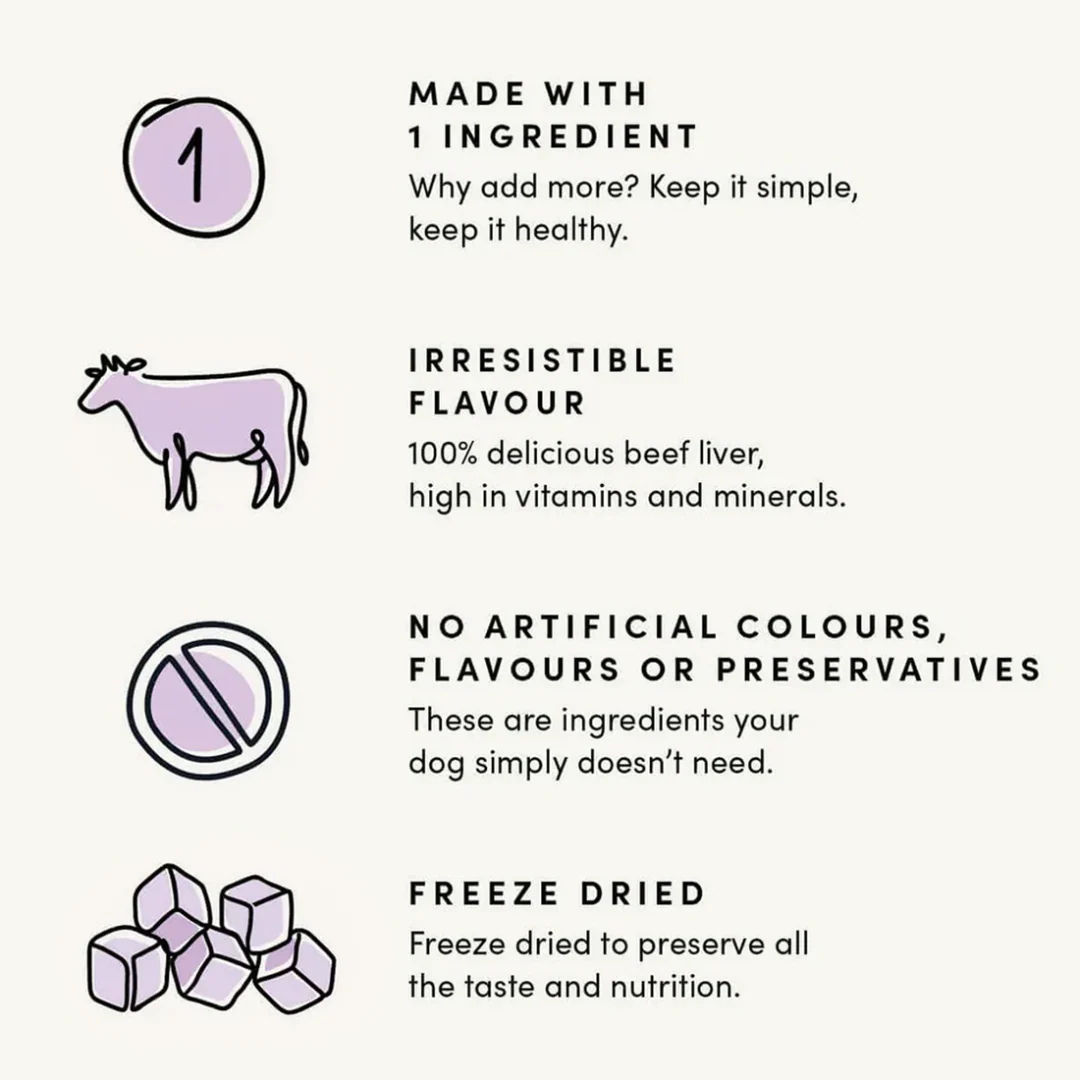 Just one ingredient, zero compromises. These Beef Liver Bites are pure Canadian beef liver — freeze-dried to lock in flavor and nutrients. Light, crunchy, and packed with protein, they’re ideal as a high-value snack, training reward, or topper for your dog’s meals.