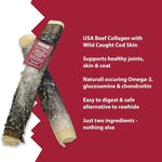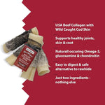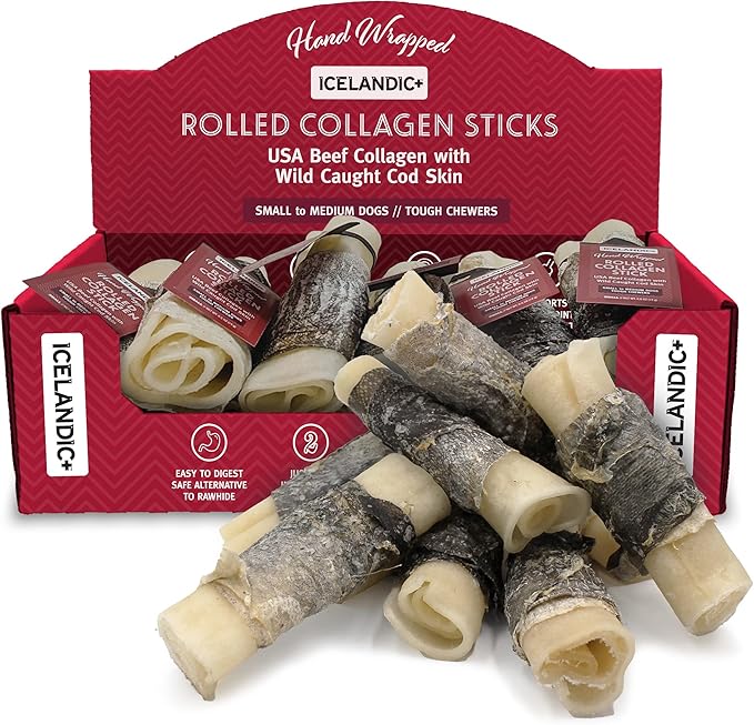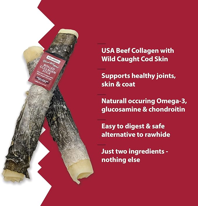 The Icelandic+ Beef Collagen Rolled Stick is made from beef collagen and wild-caught cod skin. It helps clean teeth, supports skin, coat, and joint health, and is fully digestible and rawhide-free.